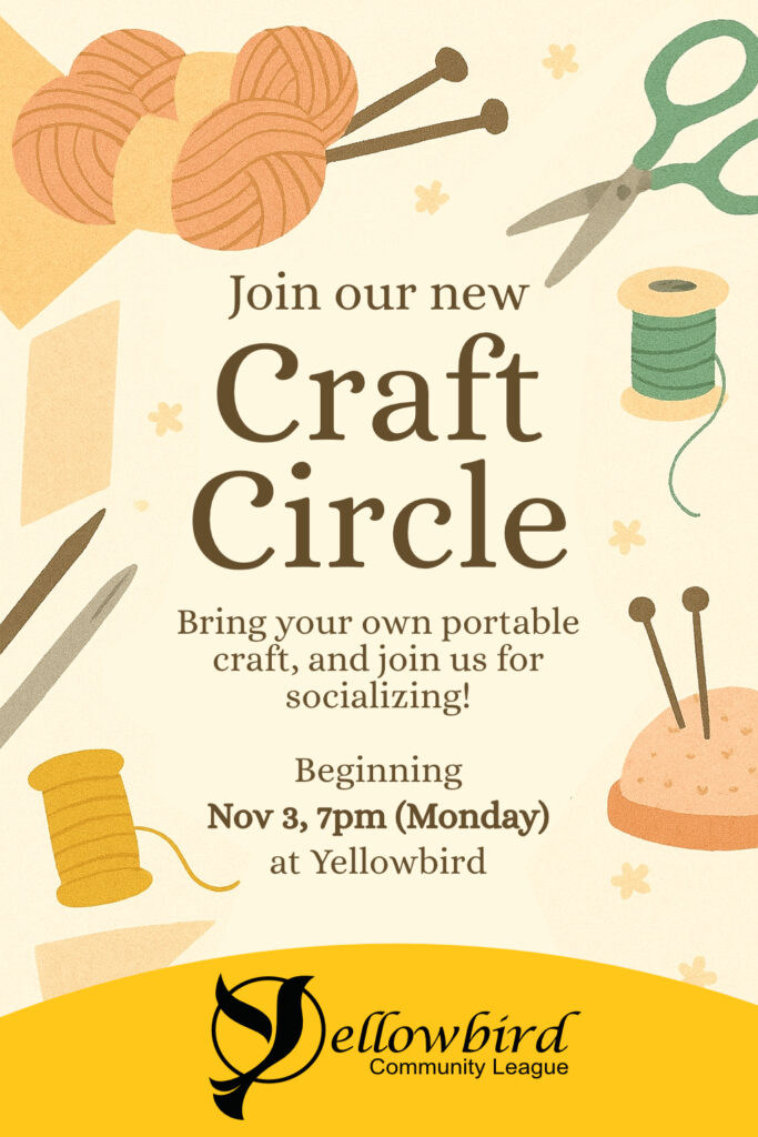 Join us for a monthly Craft Social Night at Yellowbird Community League Hall. Bring your own project, relax, and enjoy an evening of creativity and conversation. Free and open to all!