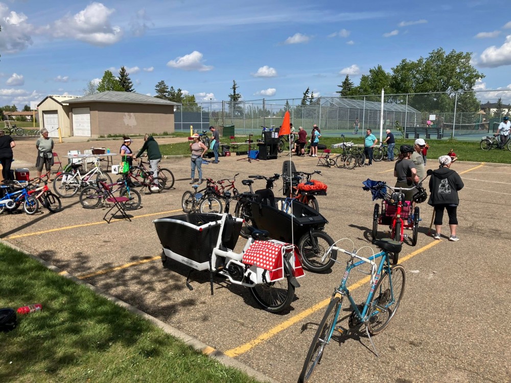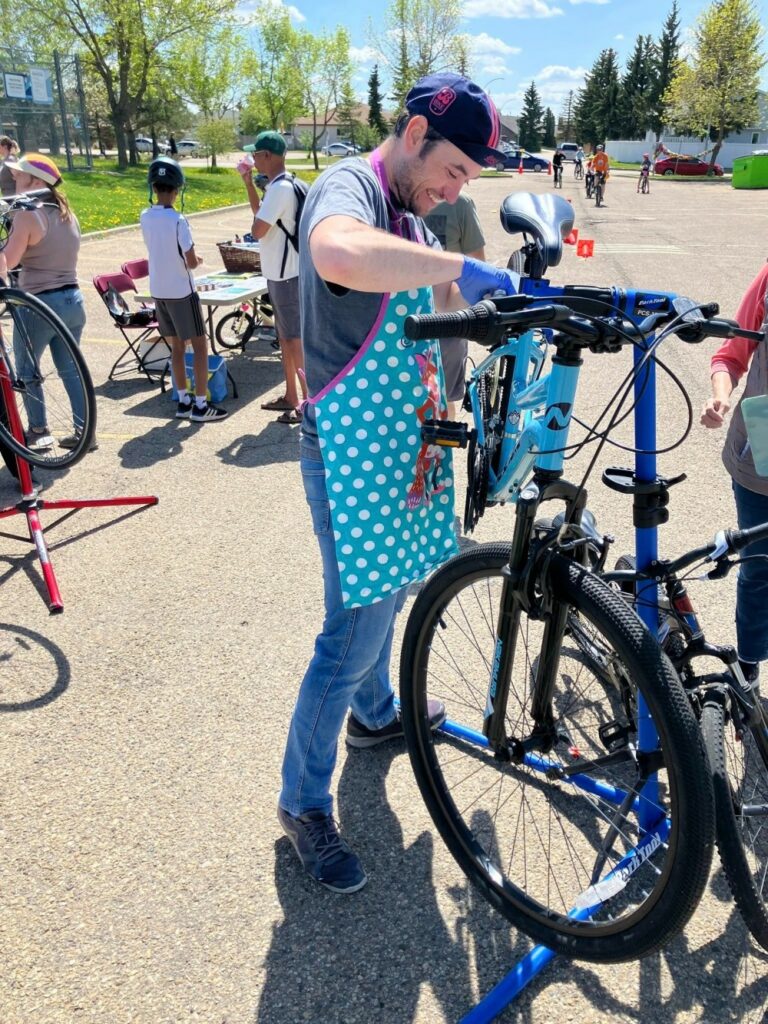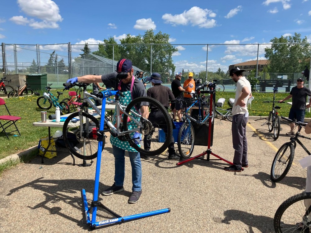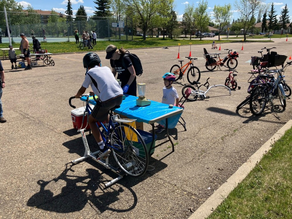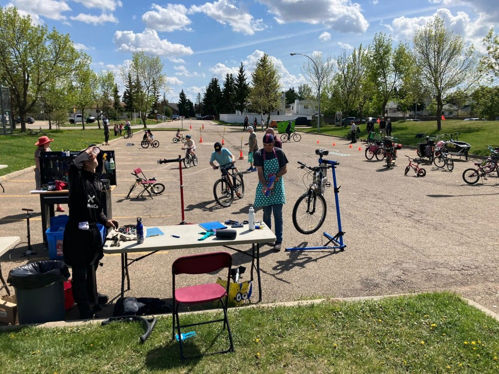 Spring 2025 was the first ever Bike Fest at Yellowbird Community League. Specially trained volunteer bicycle mechanics completed 70 (seventy) FREE bike tune-ups. The smoothies created in blenders powered by pedal power were a huge hit – we ran out of smoothie ingredients. Donated previously loved bicycles were tuned-up and found new homes in our community. The community league parking lot was set up as a bike track so the kids could practice and hone their riding skills ripping around the track.