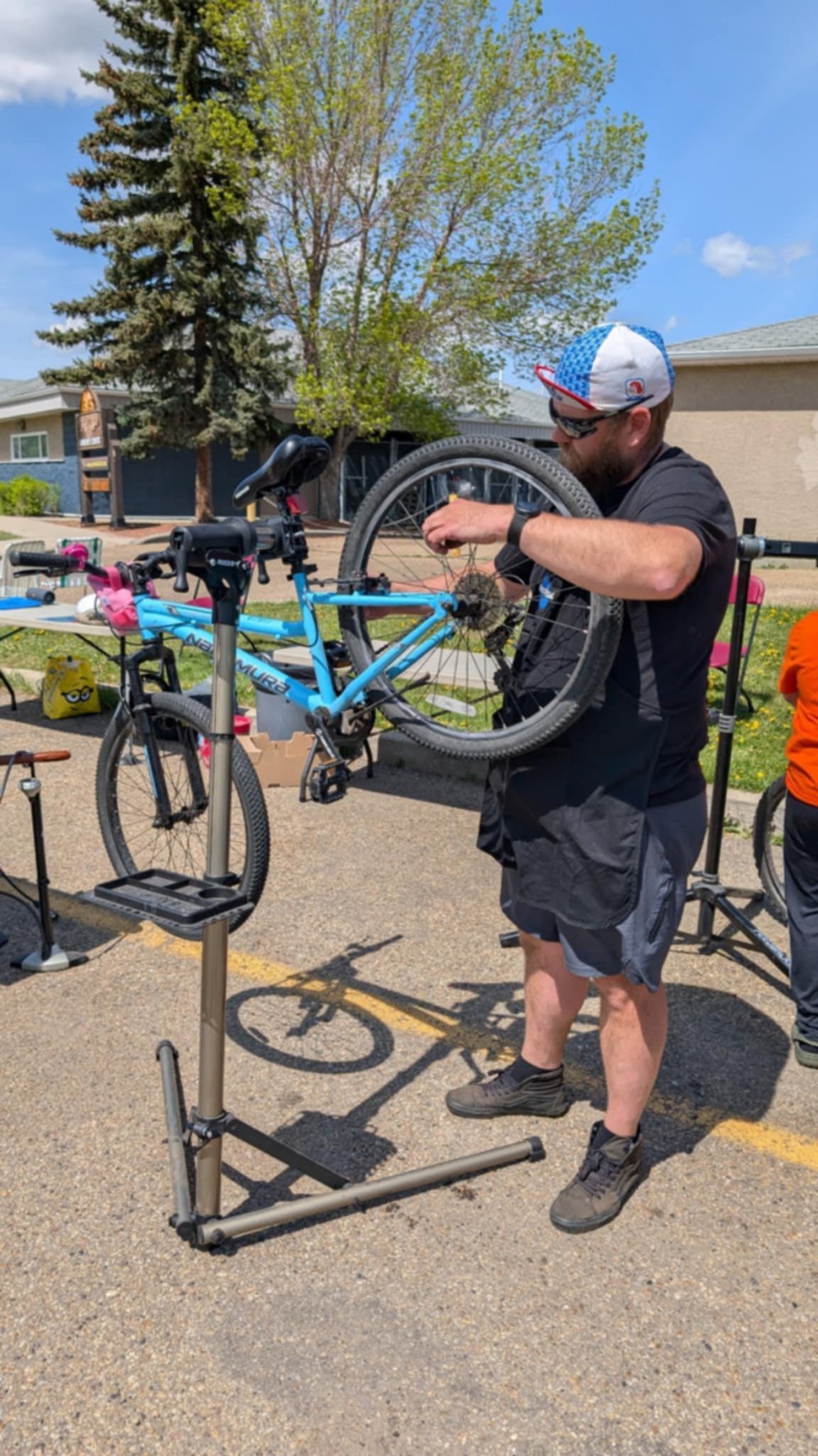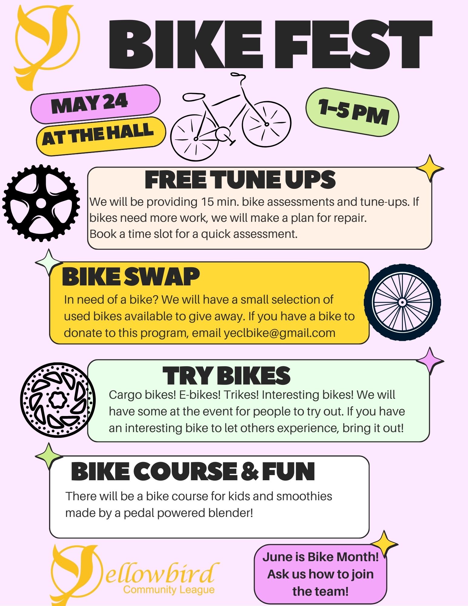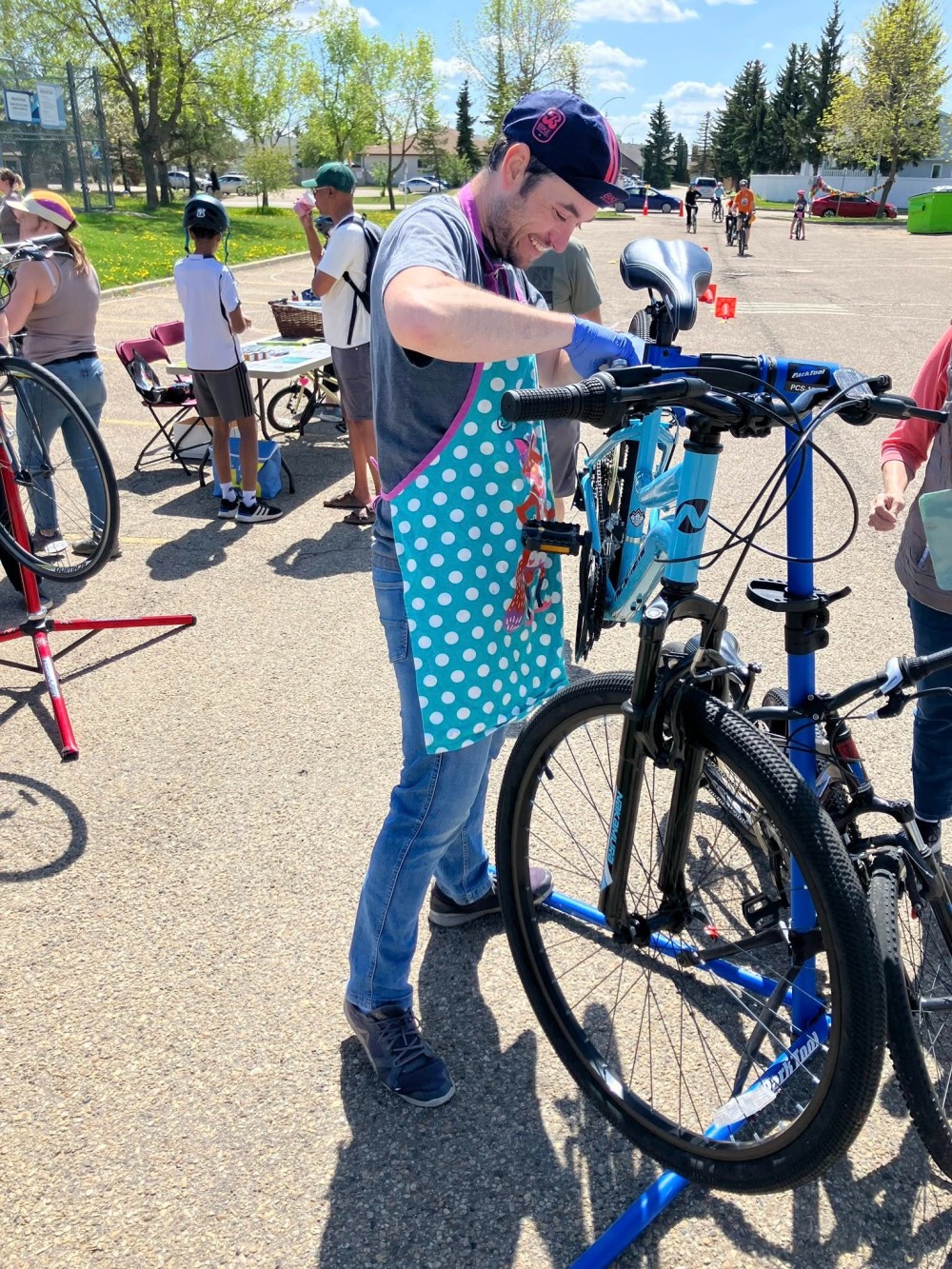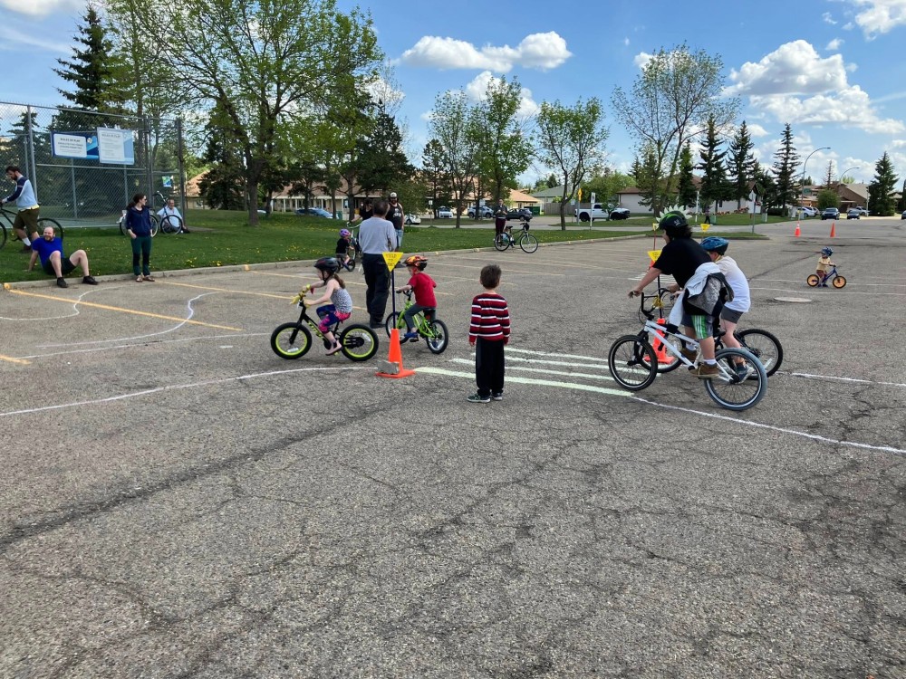 Spring 2025 was the first ever Bike Fest at Yellowbird Community League. Specially trained volunteer bicycle mechanics completed 70 (seventy) FREE bike tune-ups. The smoothies created in blenders powered by pedal power were a huge hit – we ran out of smoothie ingredients. Donated previously loved bicycles were tuned-up and found new homes in our community. The community league parking lot was set up as a bike track so the kids could practice and hone their riding skills ripping around the track.